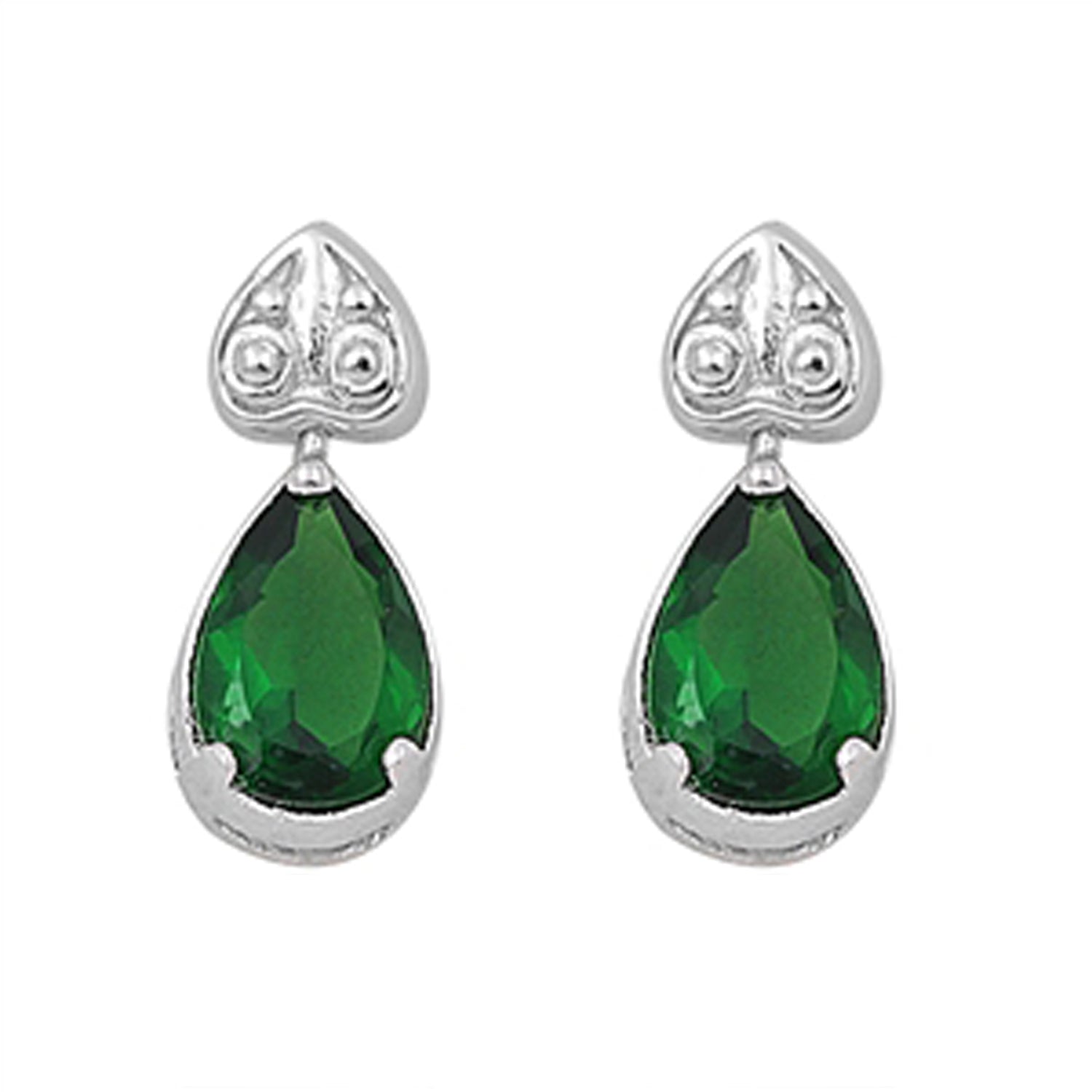 May Emerald Birthstone Cubic Zirconia Drop Dangle Earrings with Filigree Heart Post in Sterling Silver