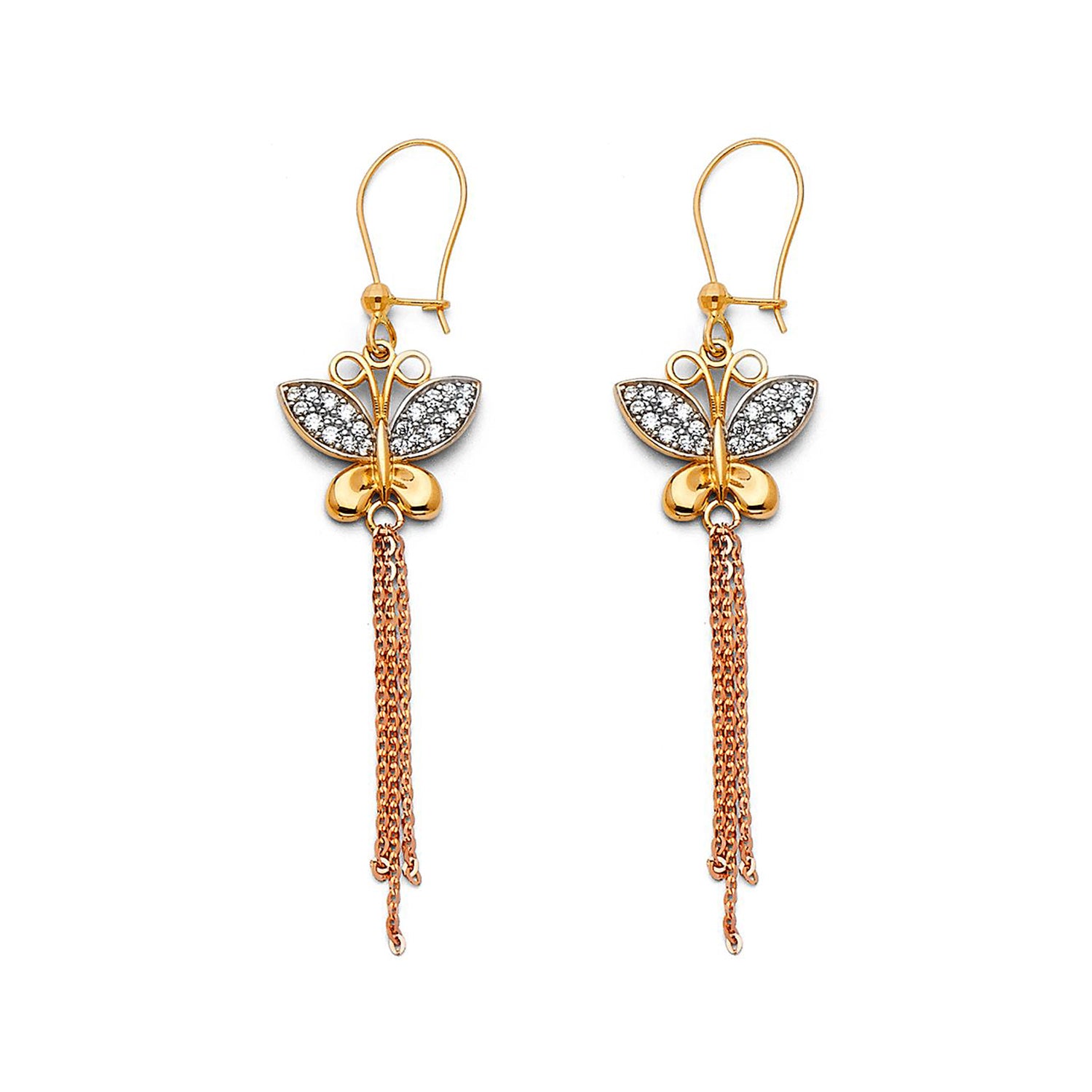 Oriental Butterfly Tassle Dangle Earrings in 14k Two Tone Gold