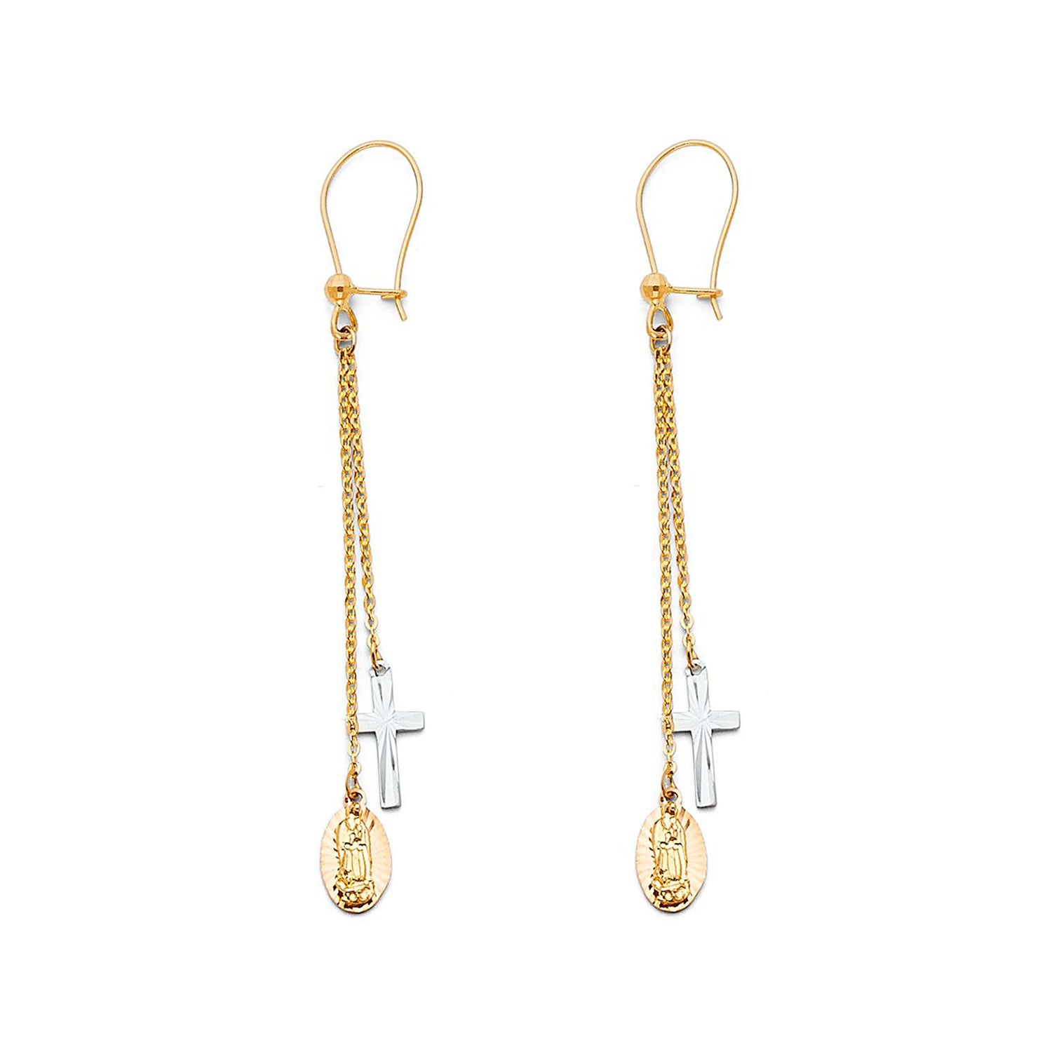 Virgin Mary & Cross Dangle Earrings in 14k Two Tone Gold