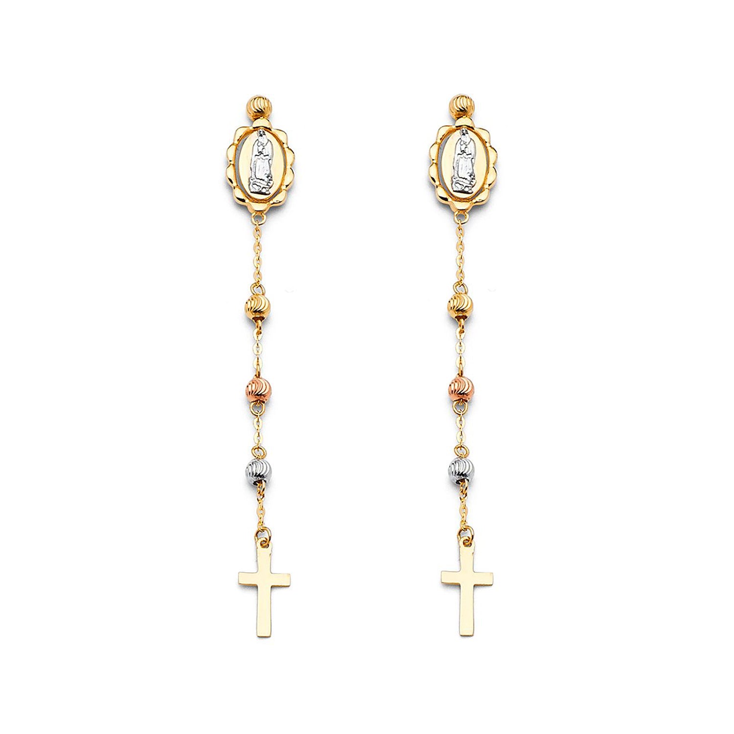 Virgin Mary Textured Beads Plain Cross Dangle Earrings in 14k Three Tone Gold