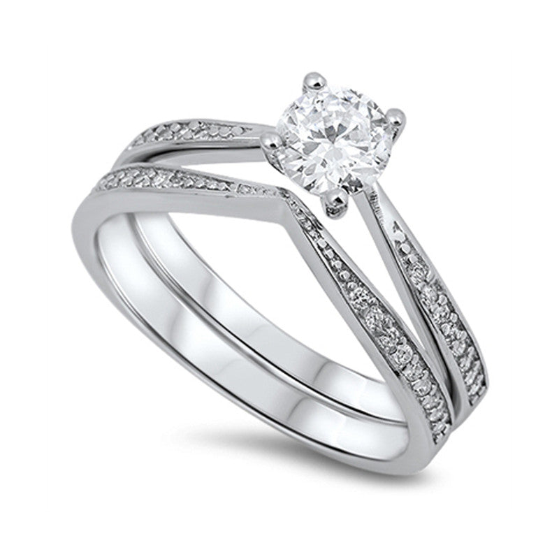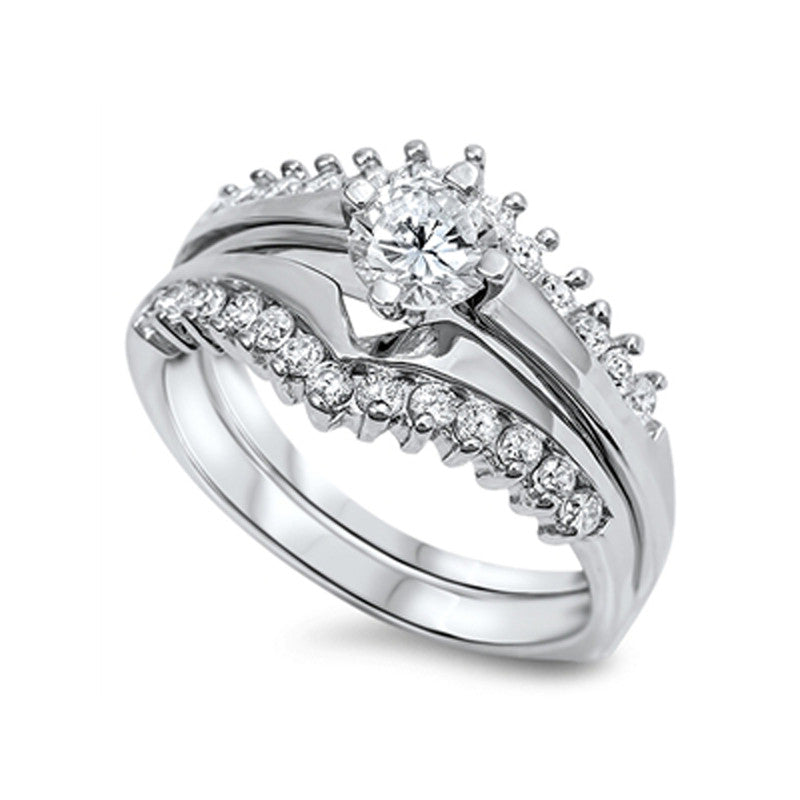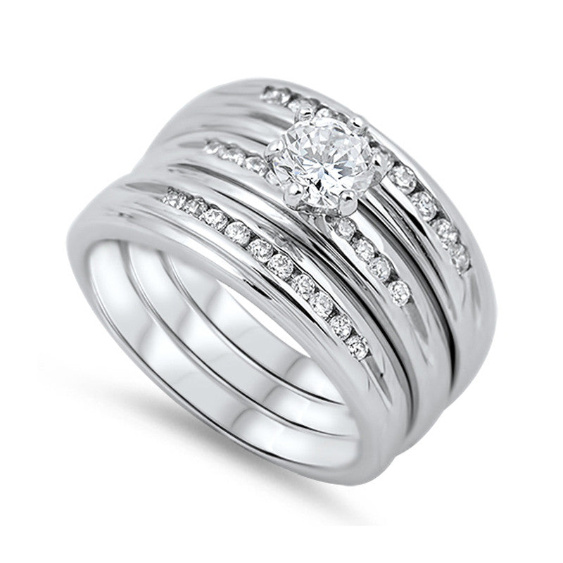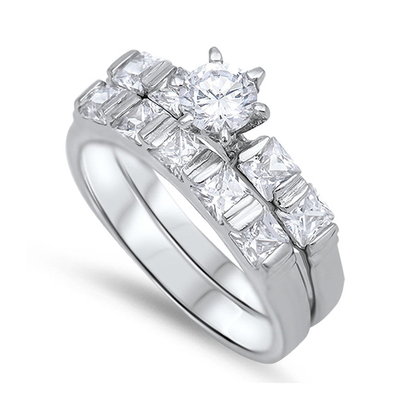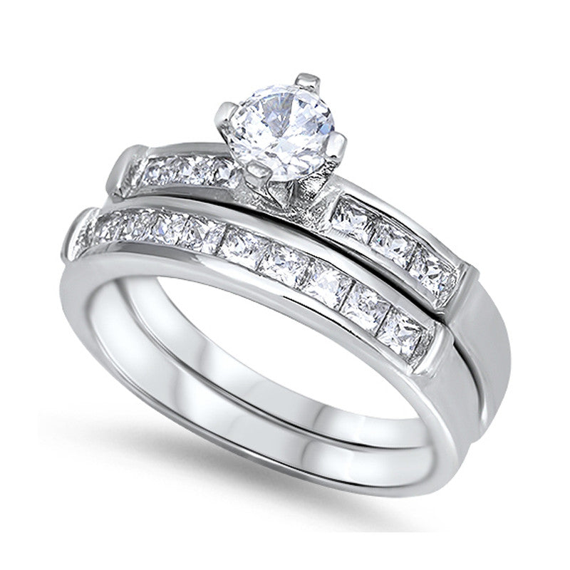 Cubic Zirconia with Sidestones Engagement Wedding Ring Set in Sterling Silver
