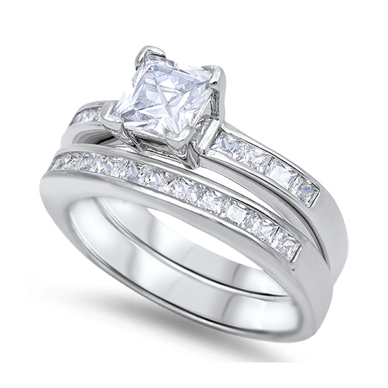 V-Prong Princess Cut Cubic Zirconia Engagement Wedding Ring Set