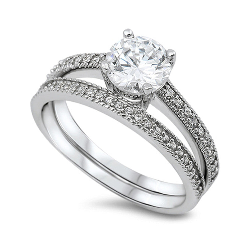 Round Cut Cubic Zirconia Engagement Wedding Ring Set in Sterling Silver