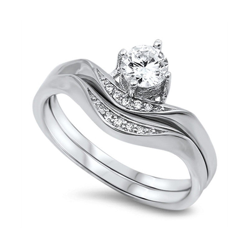 Wave Design Cubic Zirconia Engagement Wedding Ring Set in Sterling Silver