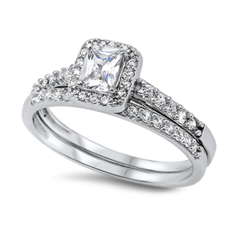 Petite Engagement Wedding Ring Set Emerald-cut Cubic Zirconia in Sterling Silver