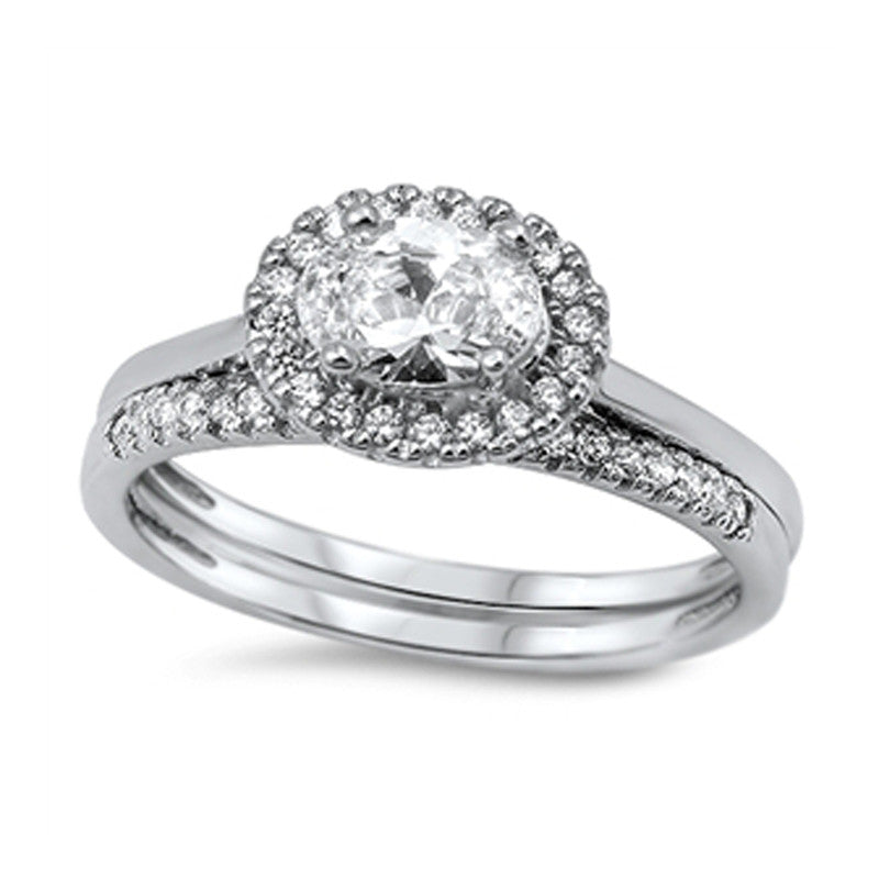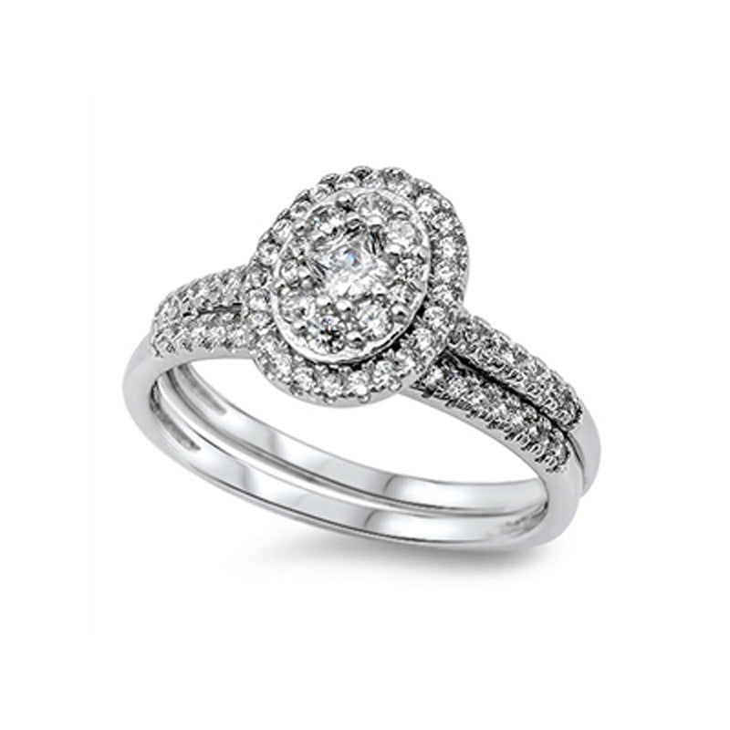 Oval Cubic Zirconia Halo Style Bridal Engagement Wedding Ring Set