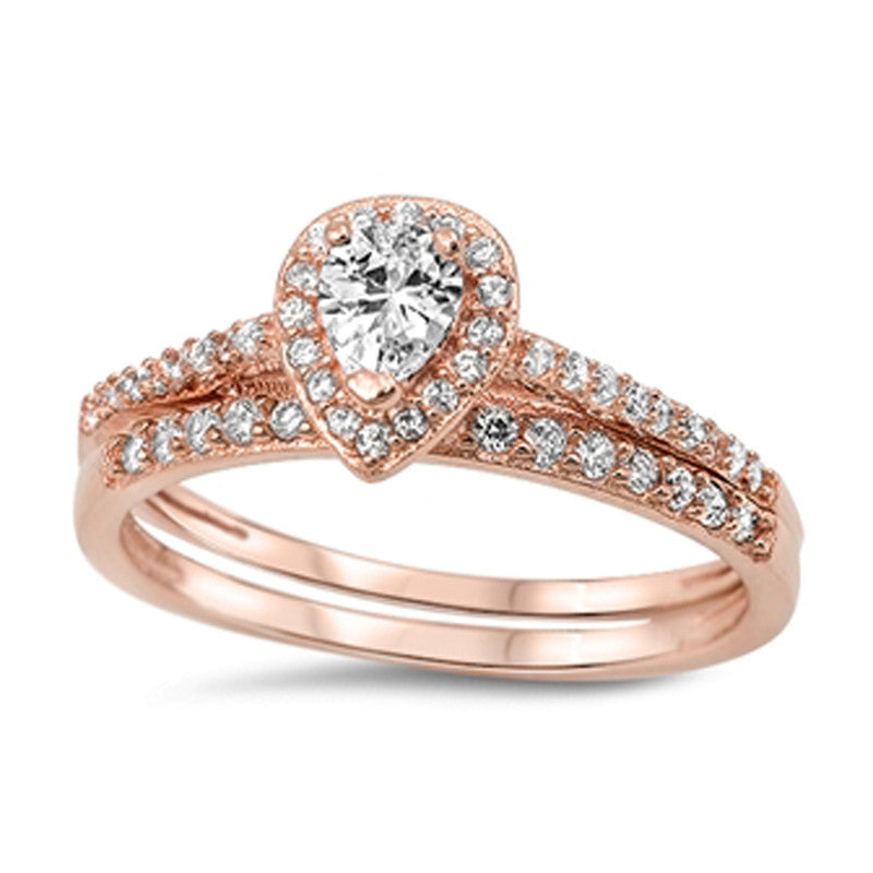 Rose Gold Tone Pear Shaped Cubic Zirconia Bridal Engagement Wedding Ring Set