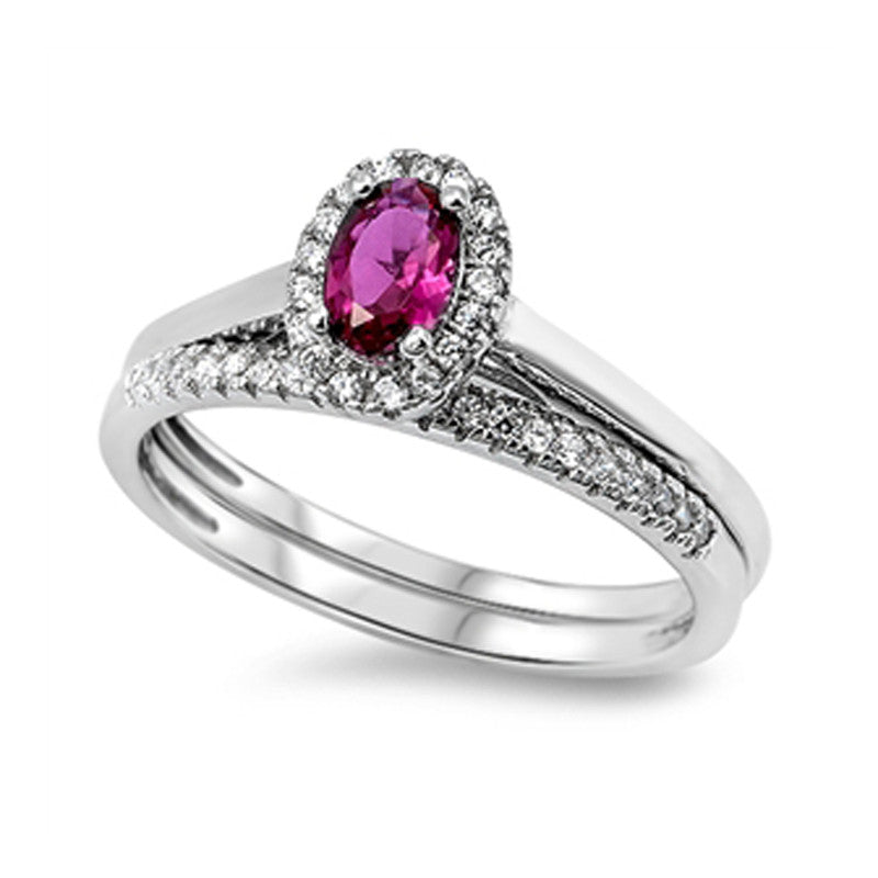 Oval Shape July Birthstone Cubic Zirconia Bridal Halo Engagement Ring Set