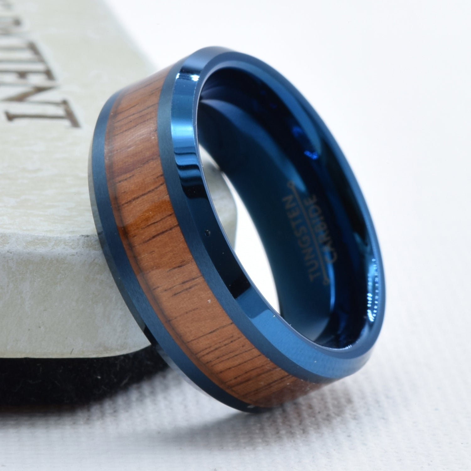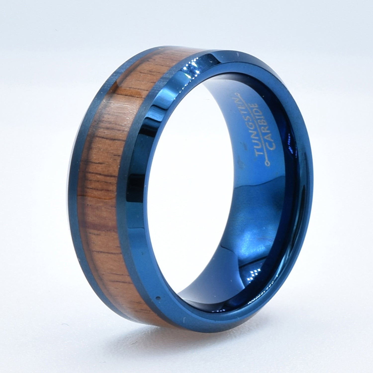 Blue Wedding Band with Koa Wood Inlay in Tungsten