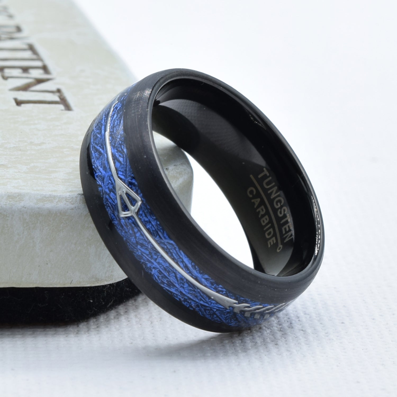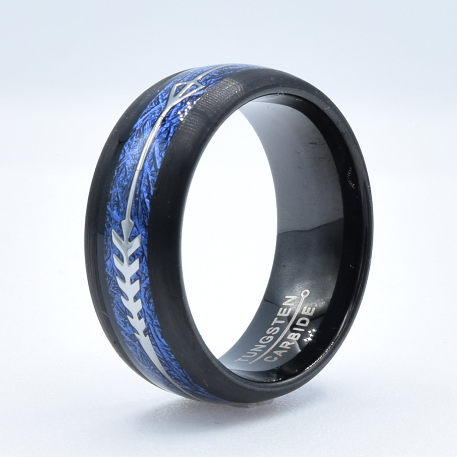 Simulated Blue Meteorite Arrow Wedding Band in Tungsten