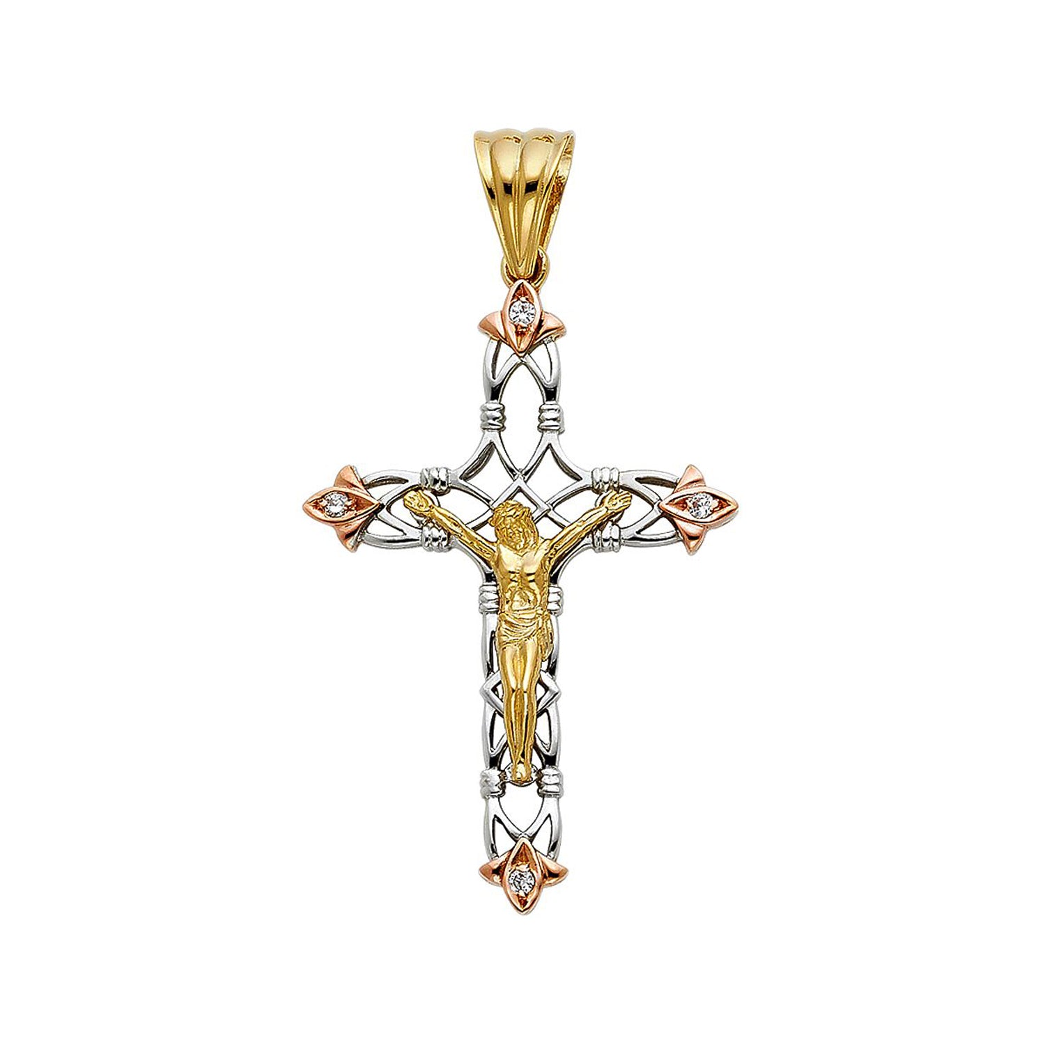 Latticework Crucifix Cross Cubic Zirconia Pendant in 14k Tri Color Gold