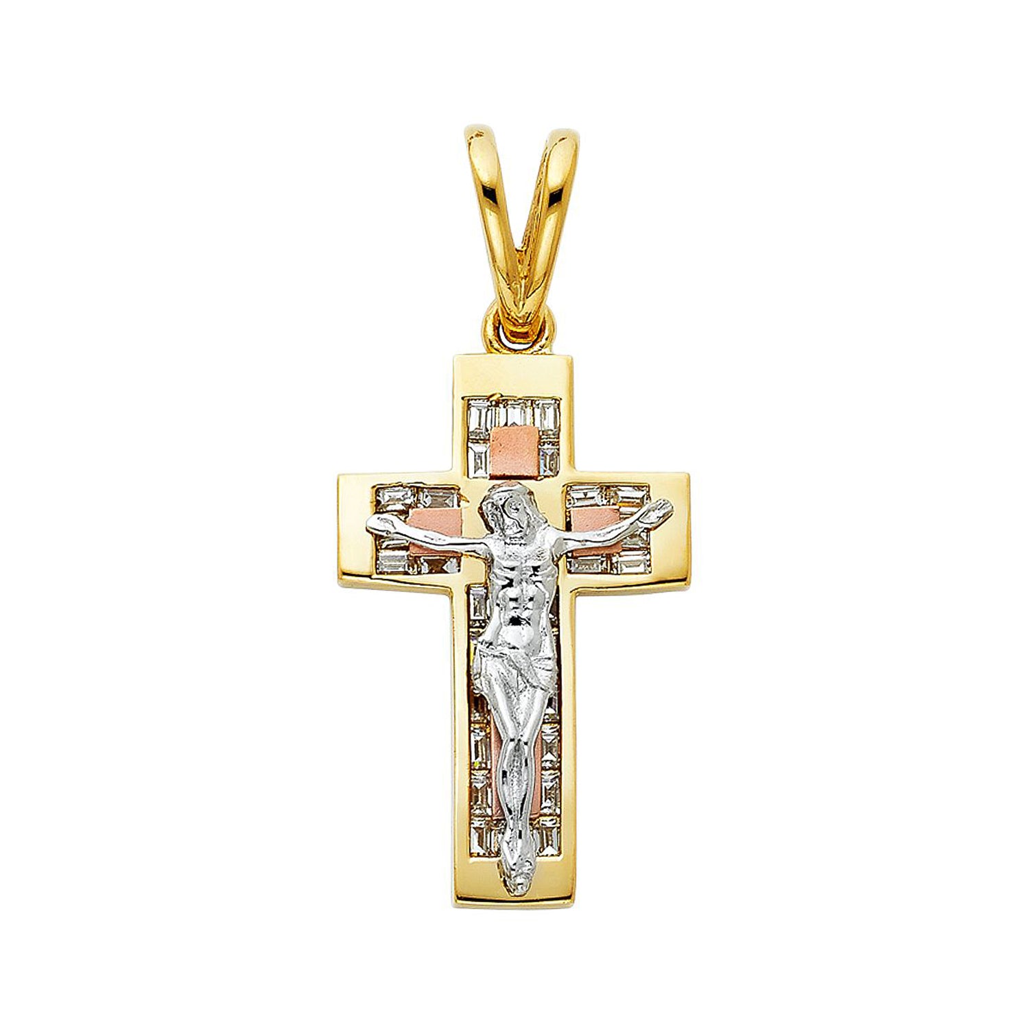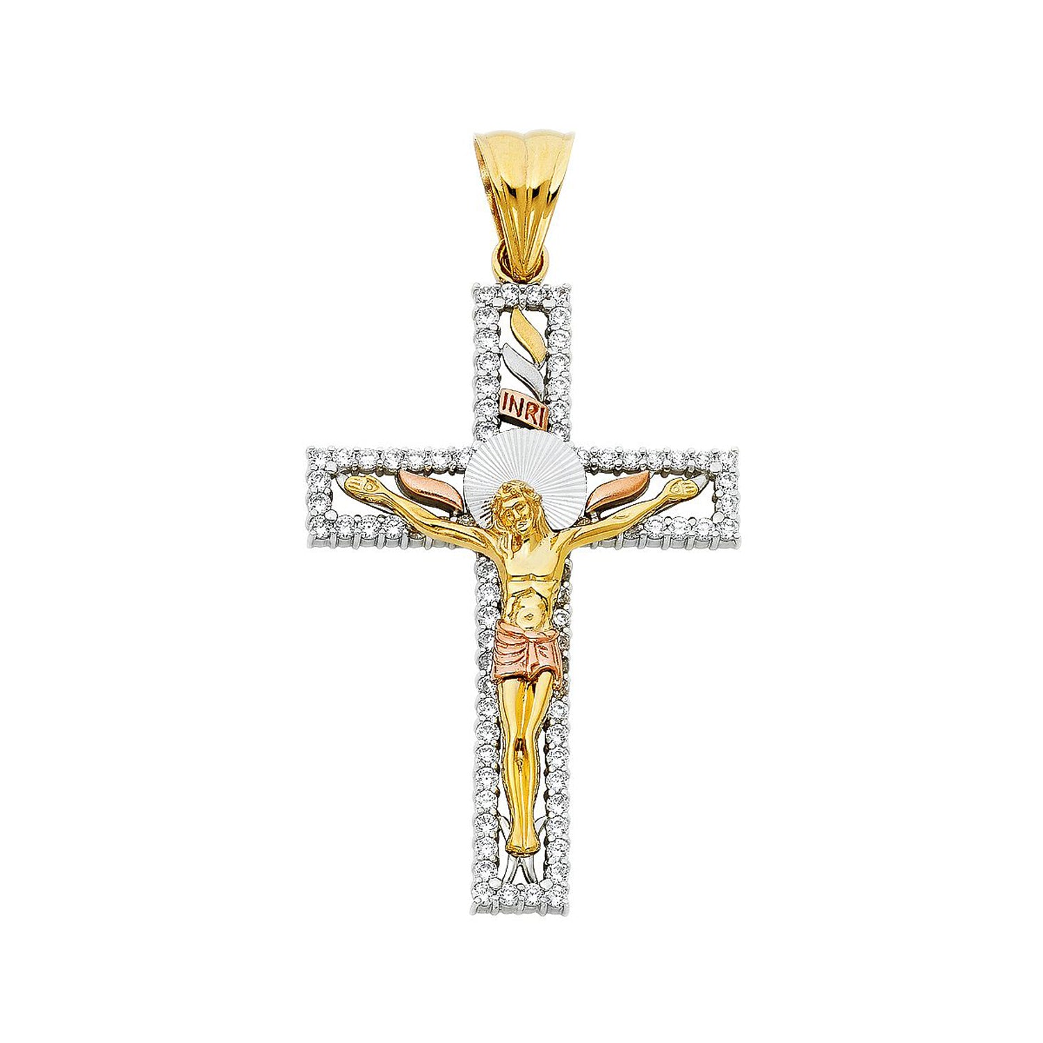 INRI Crucifix Cut-out Cubic Zirconia Pendant in 14k Tri Color Gold