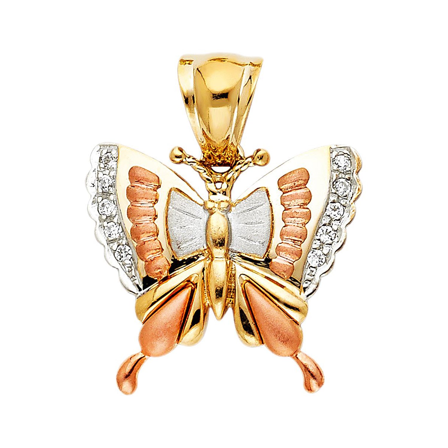 Cubic Zirconia Butterfly with Rose Accent Pendant in 14k Tri Color Gold