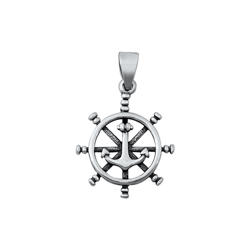 Ship's Steering Wheel with Anchor Pendant in Sterling Silver