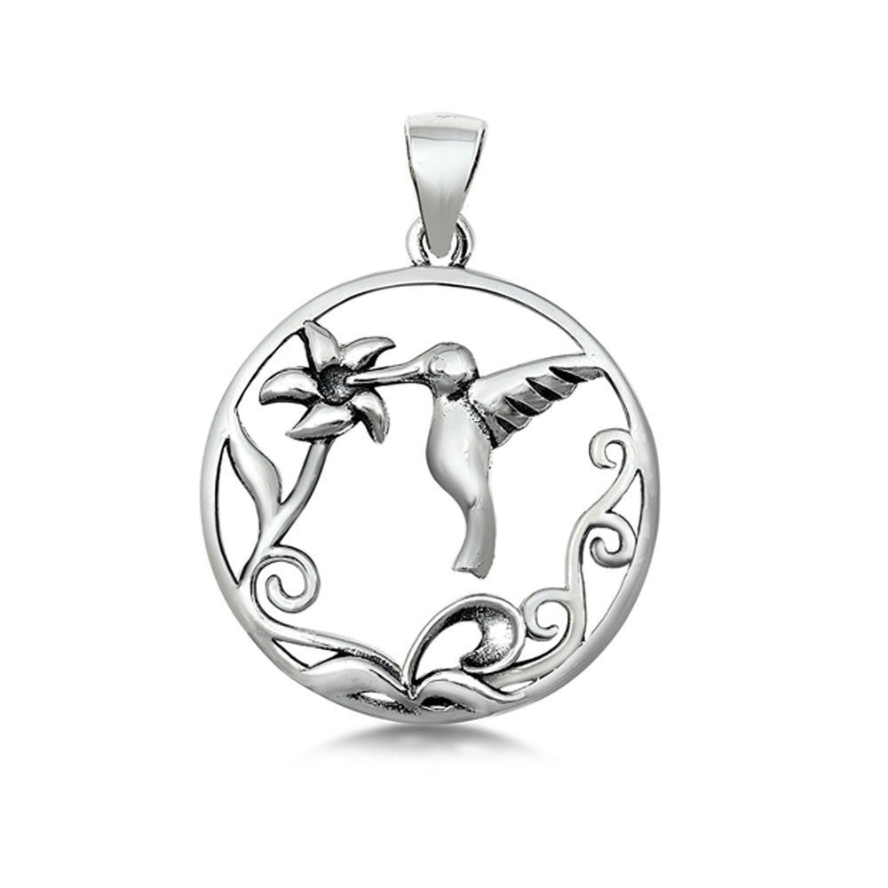 Hummingbird with Flower Circle Pendant in Sterling Silver