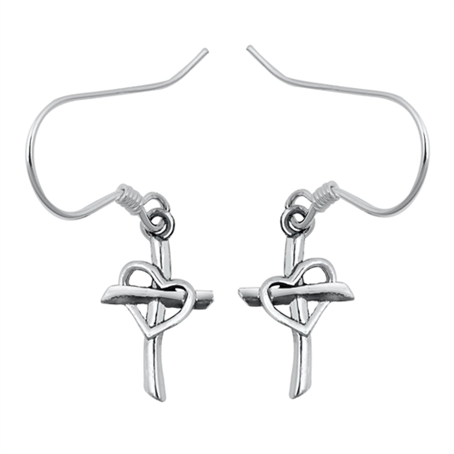 Cross with Heart Center Dangle Earrings Sterling Silver