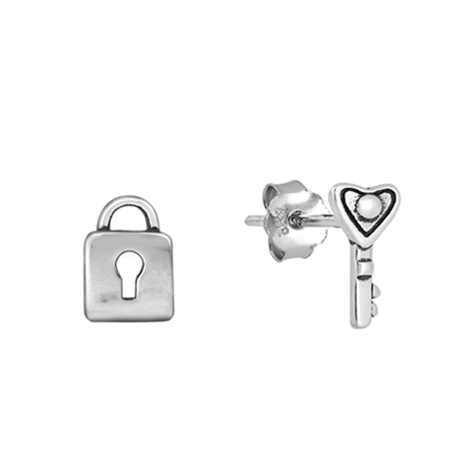 Key with Padlock Mismatched Stud Earrings in Sterling Silver