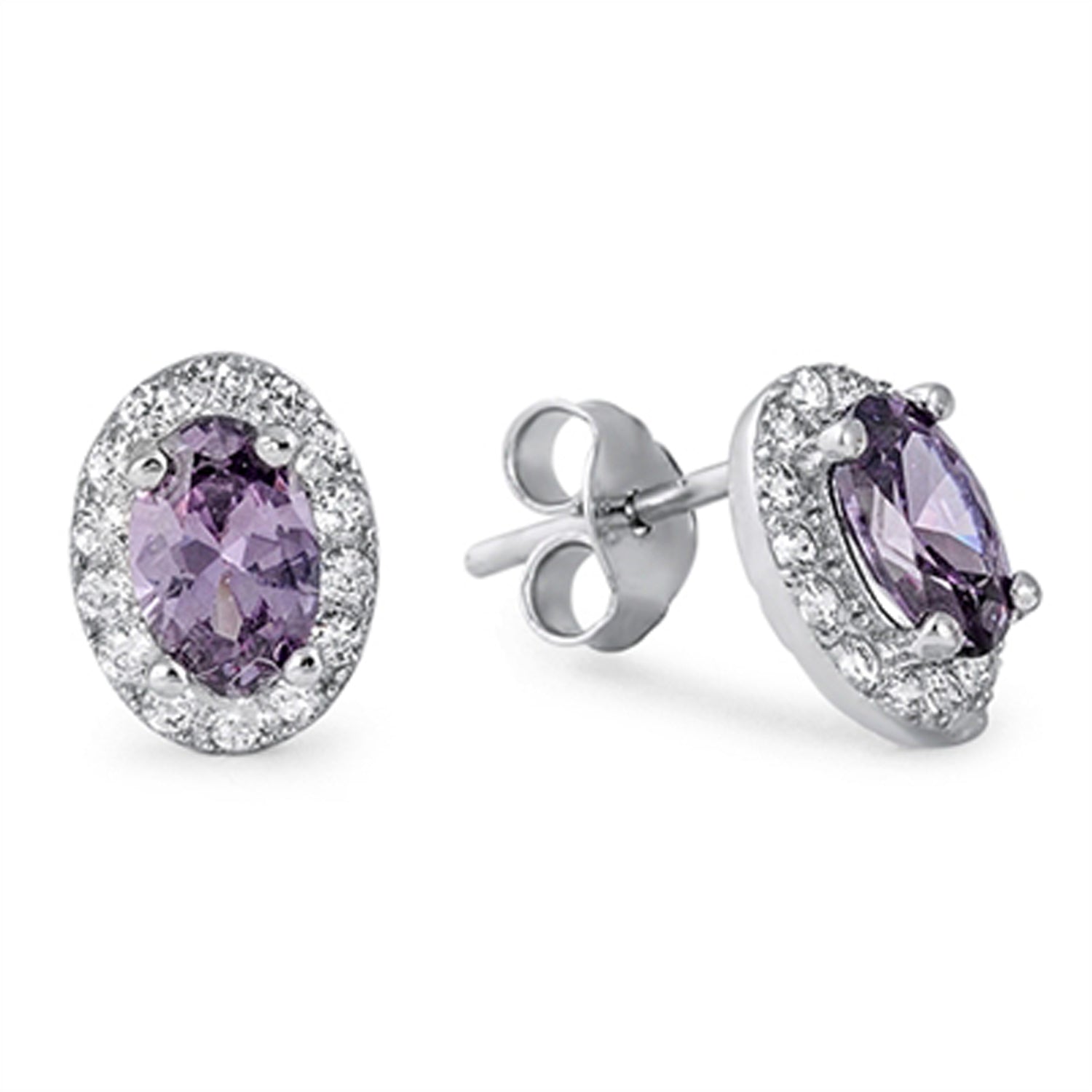 Oval Shaped February Birthstone Cubic Zirconia Halo Stud Earrings in Sterling Silver