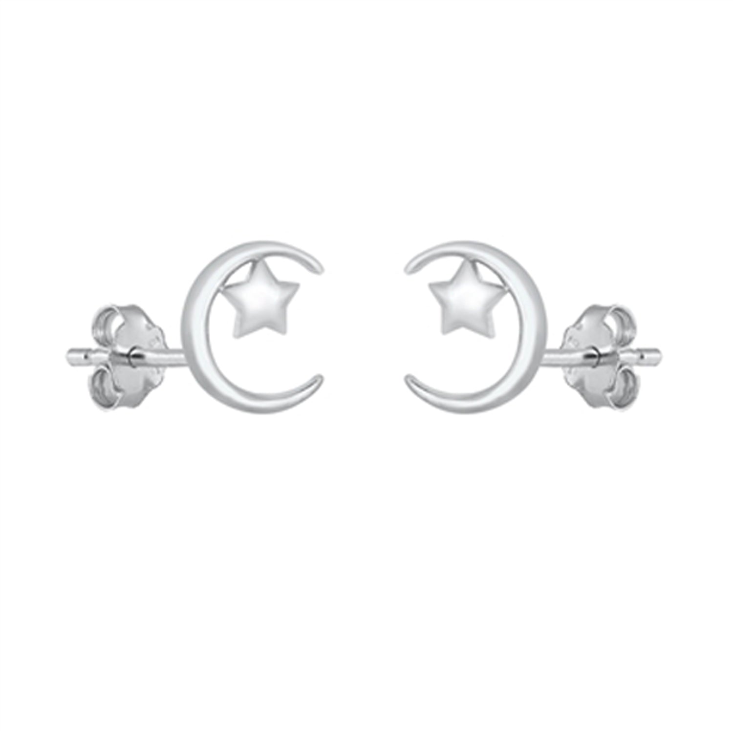 Petite Moon with Hanging Star Stud Earrings in Sterling Silver