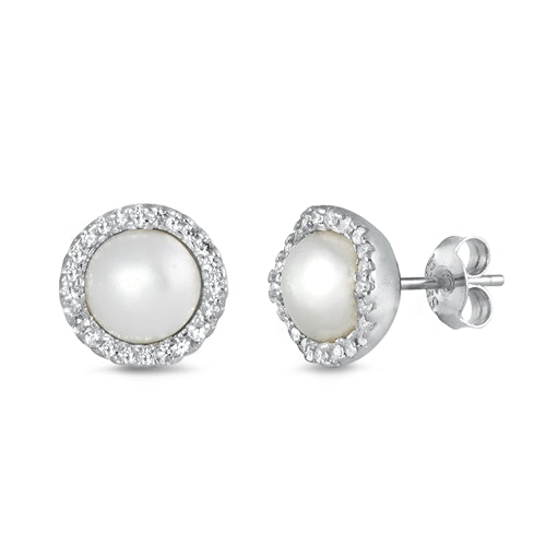 Halo Pearl Stud Earrings Cubic Zirconia in Sterling Silver
