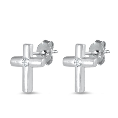 Rounded Cross Stud Earrings Cubic Zirconia Accent in Sterling Silver