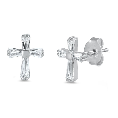 Tapered Baguette Cubic Zirconia Cross Stud Earrings in Sterling Silver